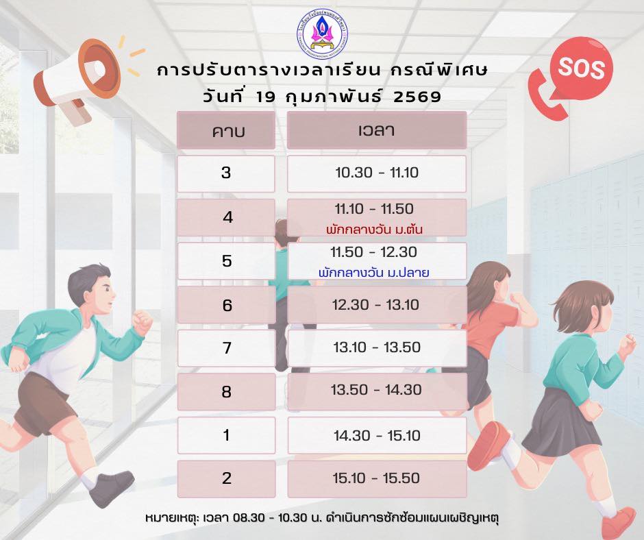 แจ้งการปรับตารางเวลาเรียน กรณีพิเศษ เนื่องในการดำเนินการซักซ้อมแผนเผชิญเหตุ กรณีคนร้ายกราดยิงและจับตัวประกัน