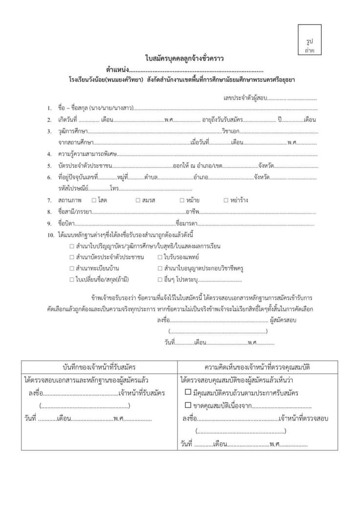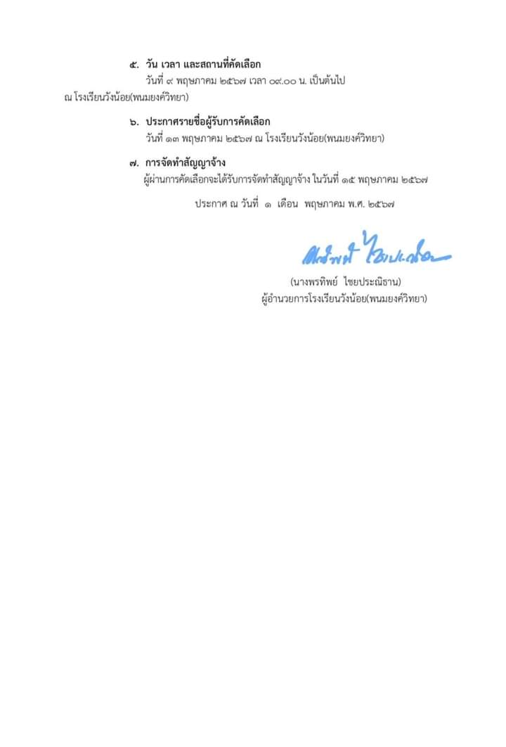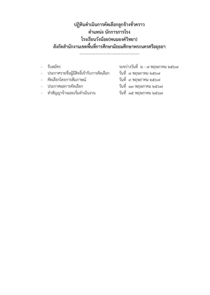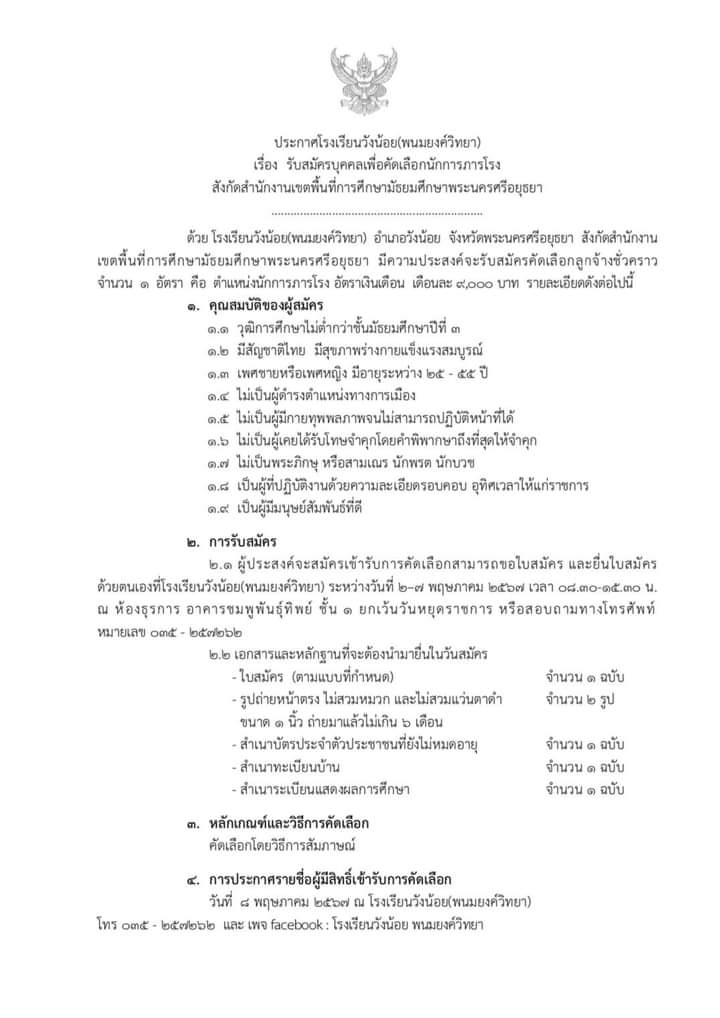 ประกาศโรงเรียนวังน้อย(พนมยงค์วิทยา) เรื่อง รับสมัครบุคคลเพื่อคัดเลือกนักการภารโรง