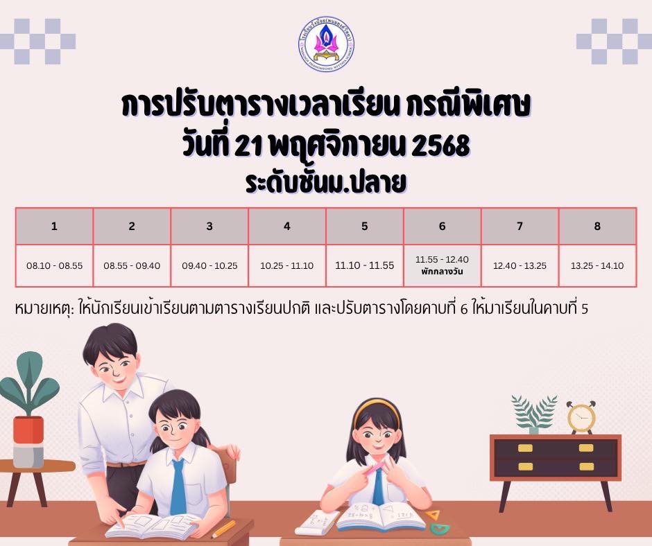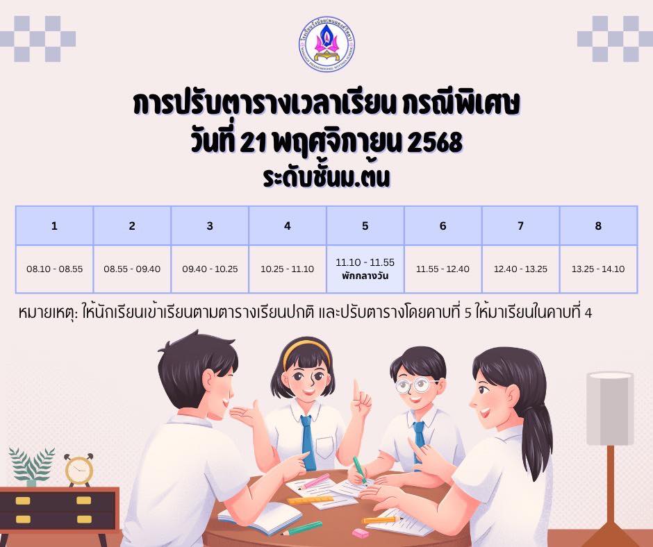 ให้นักเรียนทุกคนเข้าเรียนตามตารางเวลาที่กำหนด และเลิกเรียนเวลา 14.10 น.