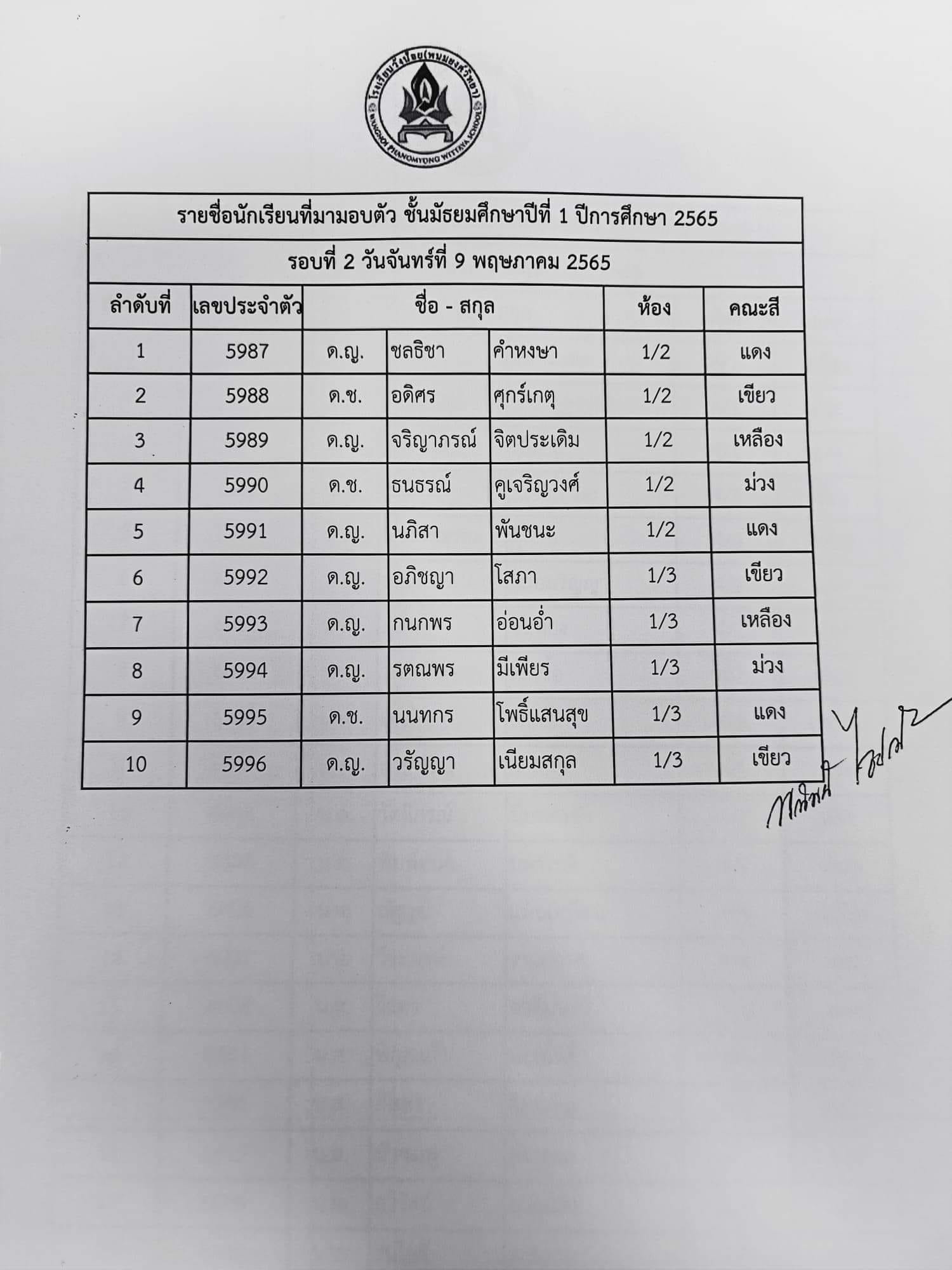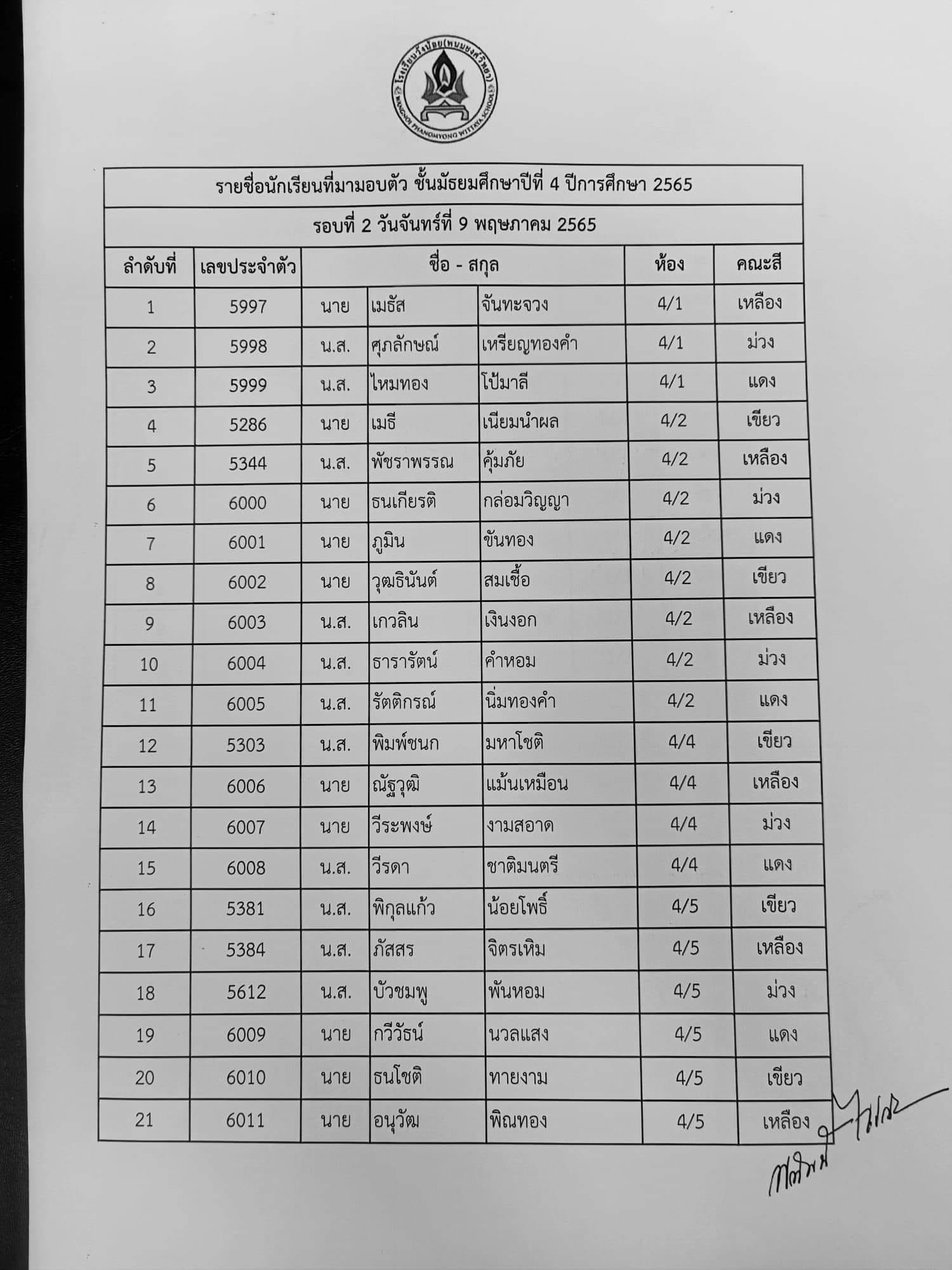 ประกาศรายชื่อนักเรียนระดับชั้นม.1 และ ม.4 ที่มามอบตัว(รอบ 2) วันจันทร์ ที่ 9 พฤษภาคม 2565