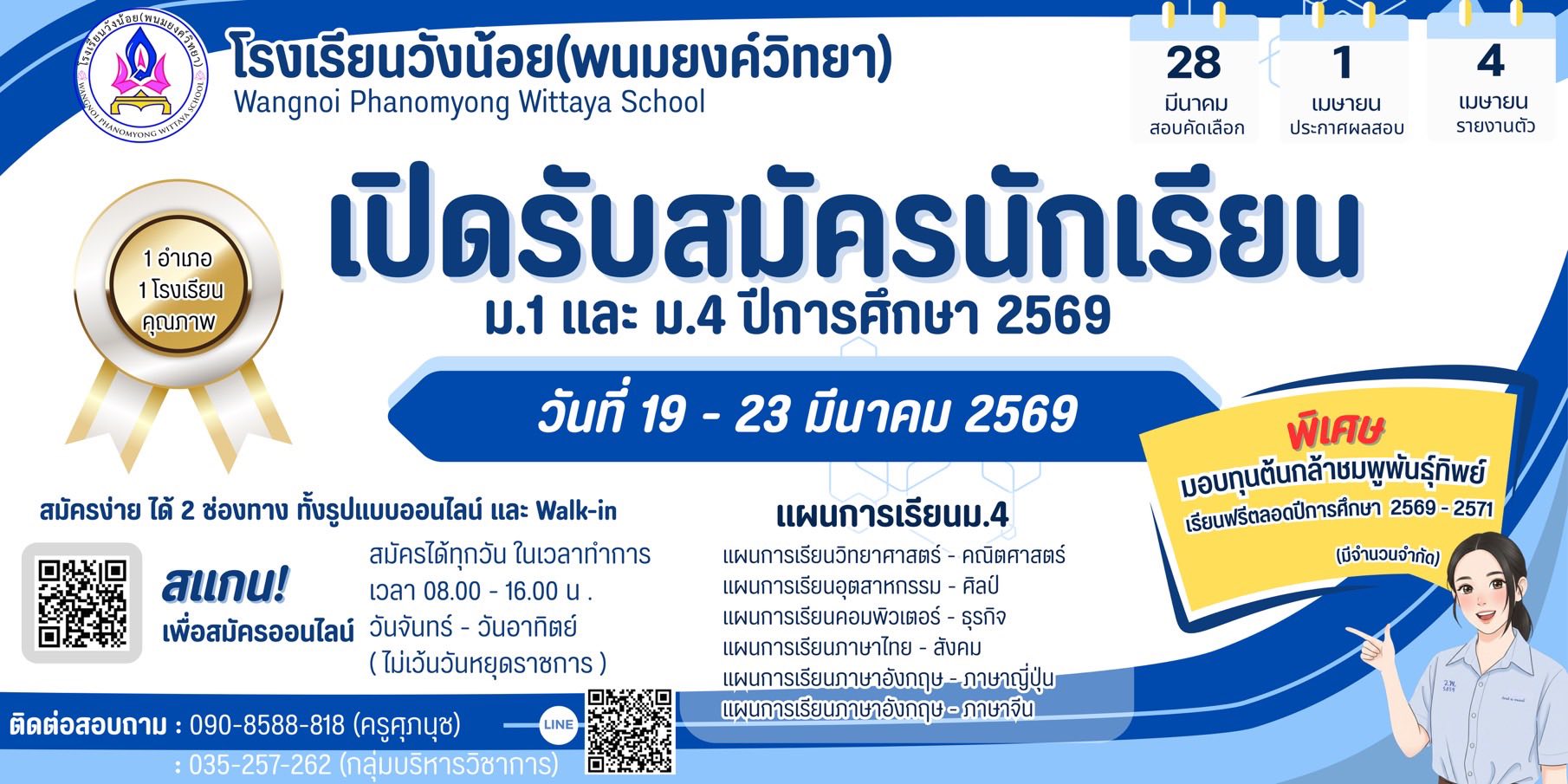 ช่องทางติดต่อ-สอบถามทางโรงเรียน โทร. 035-257253 ในวันและเวลาราชการ